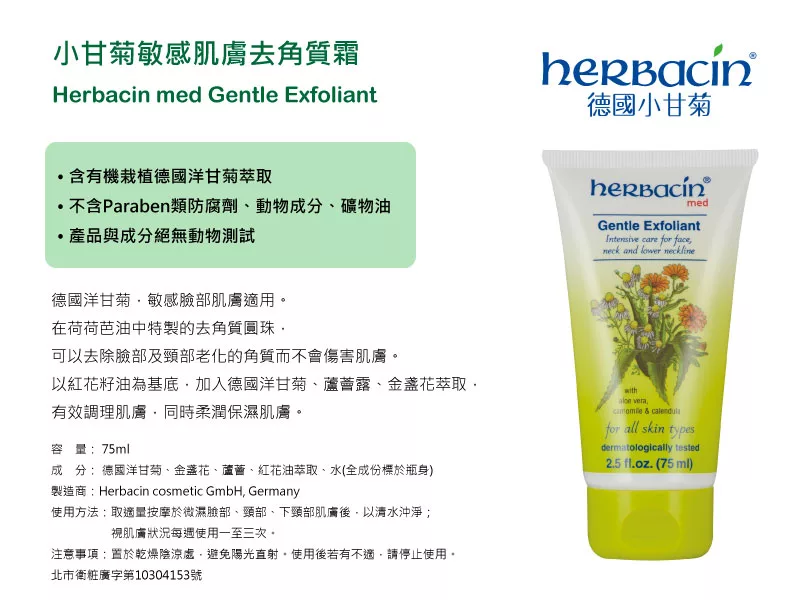 優惠商品網址如下:Herbacin德國小甘菊敏感肌膚去角質霜75ml